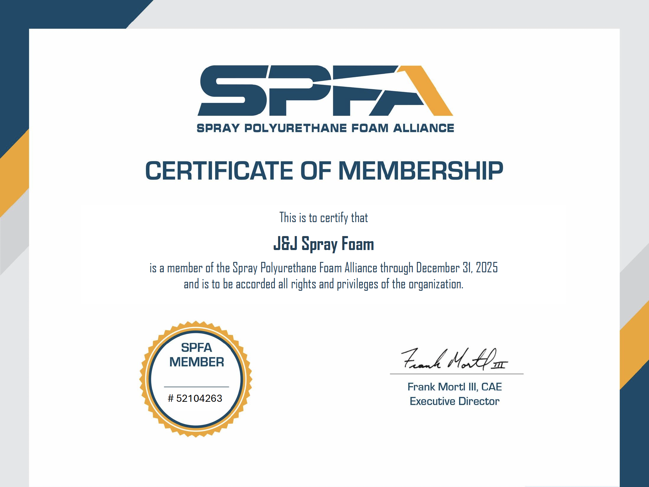 By being a certified member of the SPFA through 2025, J&J upholds the highest standards in spray foam insulation and roofing. This membership reinforces our dedication to professionalism, ongoing education, and best practices in every project we take on.