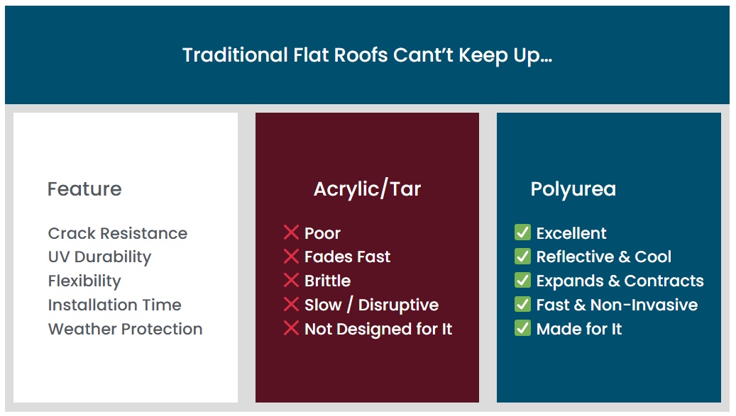 Unlike traditional roofing that requires seams, fasteners, or adhesives, polyurea forms a seamless, monolithic membrane that resists leaks, cracks, and weather damage. It is also much thicker—up to 10X thicker than conventional coatings—providing enhanced durability.